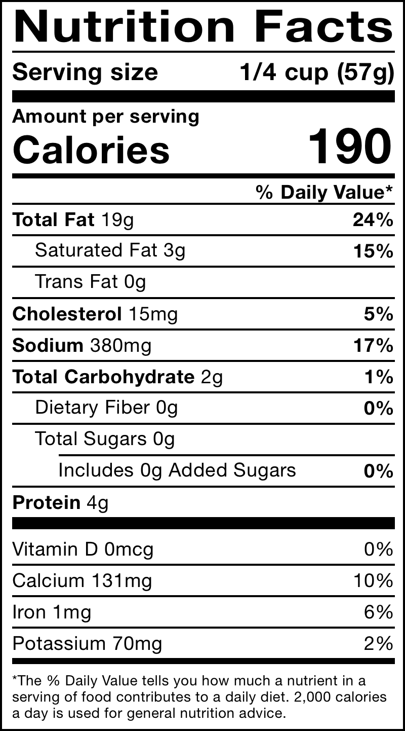 Basil, Canola Oil, Water, Parmesan Cheese (Pasteurized Part Skim Cows’ Milk, Cheese Cultures, Salt, Enzymes), Dehydrated Garlic, Salt.